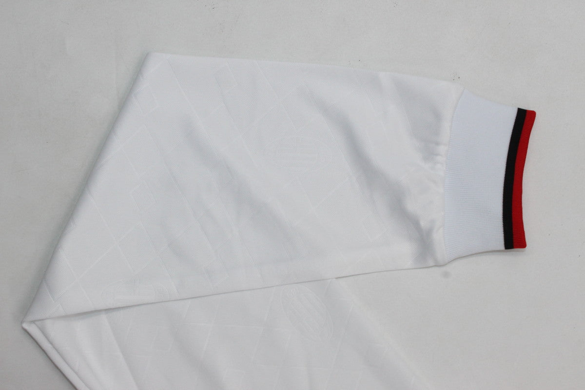 A white away shirt with a red and black horizontal chest stripe and matching striped collar and cuffs, worn during AC Milan’s 1993/94 season of defensive mastery, domestic dominance, and European glory.